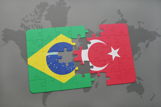 puzzle with the national flag of czech republic and turkey on a world map background.