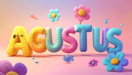 Colorful 3D 'Agustus' Lettering with Whimsical Textured Flowers on a Pastel Gradient