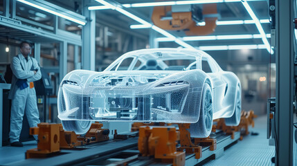 Futuristic electric car with holographic wireframe digital technology on white background