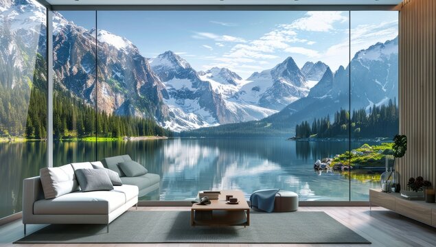 Living room interior design, glass window view of snow mountains and forest lake landscape in winter