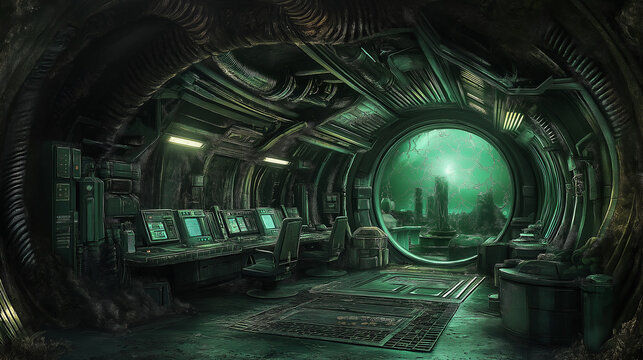 Containment pod emitting neon green vapor in high-tech research lab with glowing consoles