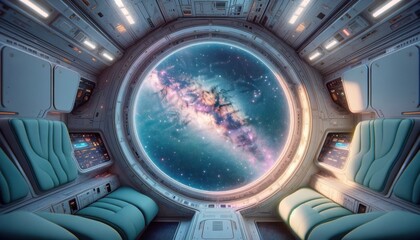 Advanced spaceship cockpit design with a circular viewport providing a stellar backdrop of stars