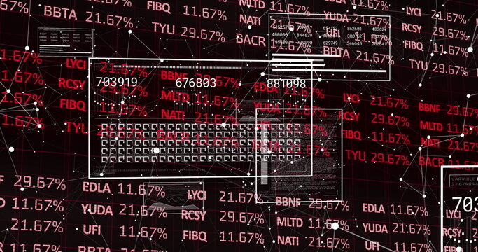 Network visualization panels floating in dashboard, with red ticker codes, percentage values, nodes