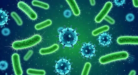 Microscopic view of virus cells, bacteria on turquoise background. Pathogens, germs floating inside body. Scientific 3d render of disease outbreak, infection, microbiology research for health crisis.