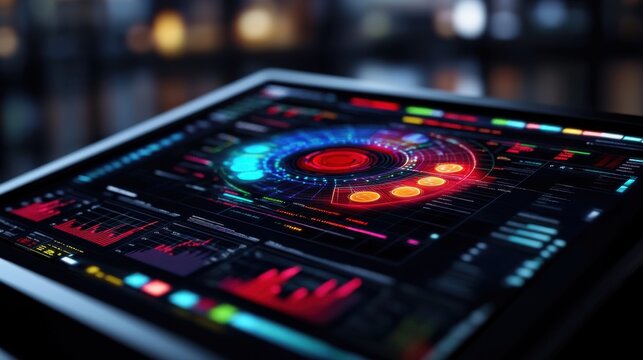 Analytics dashboard displaying neon data visualizations with charts, graphs and metrics