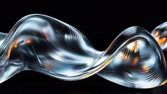 Smooth flowing translucent wave form with metallic and iridescent reflections twisting against a dark background conveying fluidity and motion