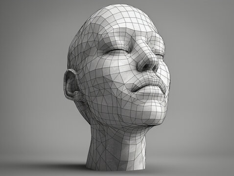 A detailed wireframe of a human head and shoulders against a black backdrop