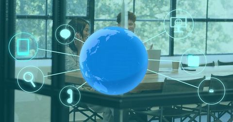 Blue 3d globe connecting remote team in coworking office with digital network overlays
