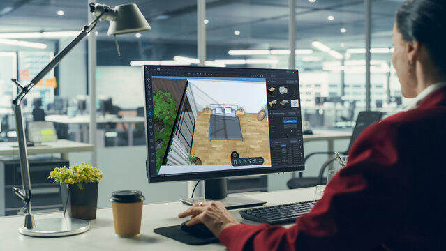Female Interior Designer Using Advanced 3D Modeling Software on a Desktop Computer to Create a Modern Living Room and Bedroom Space Layout. Specialist Creating a Stylish Environment for a Client
