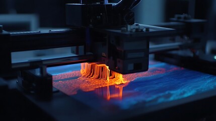 High-tech 3D printer creating vibrant patterns in a modern workshop environment