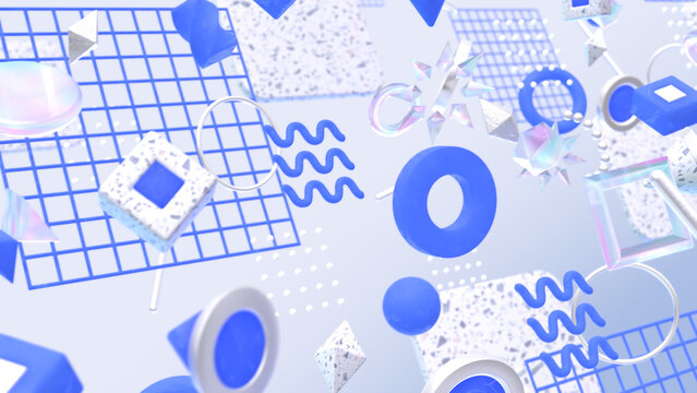 幾何学模様やテラゾー柄が並ぶ奥行き感のあるオシャレな3DCG - ニューモーフィズムカラー