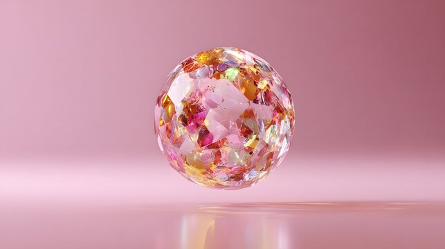 A multifaceted, colorful sphere floats on a soft, pastel pink surface, showcasing a captivating interplay of light and shadow.