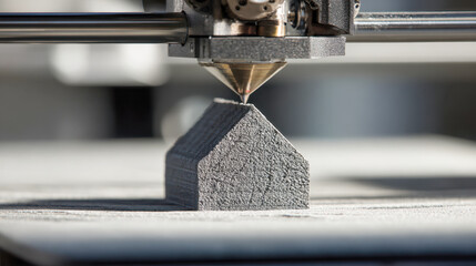 Industrial 3d printer creating a small house model with textured layers in a high-tech manufacturing environment focused on innovative construction techniques