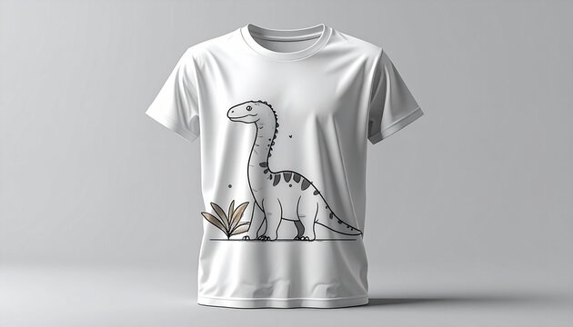 A plain white t-shirt featuring a cute cartoon dinosaur illustration on a plain background