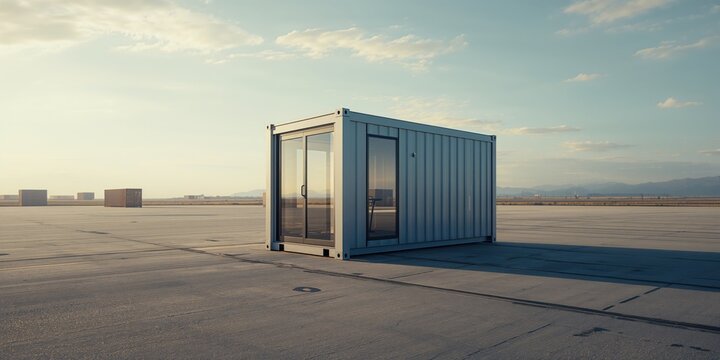 3D visualization of a portable office unit focusing on functional layout and accessibility, ideal for temporary work environments