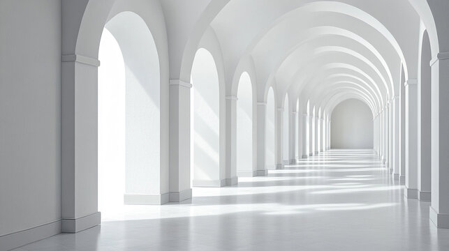 White architectural archway corridor inside a building, featuring repeating arches and depth, rendered in 3D with clean lines and modern minimalist design.