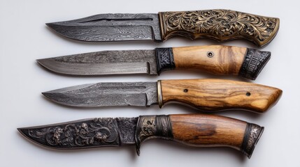 Four ornate knives with patterned metal and wood handles sit on a clean white surface