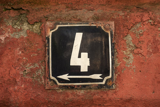 Weathered grunge square metal enameled plate of number of street address with number 4 closeup