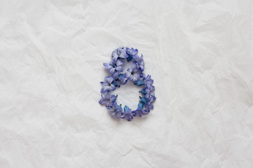 Eight of blue hyacinth flowers on a white paper background. flat lay, top view, copy space,place for text. March 8, spring, flowers International Women's Day.