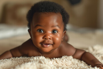 cute african american 4 month old baby tummy time beige background