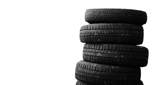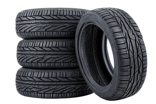 A stack of sturdy, reliable new car tires ready for the open road, showcasing deep tread and a robust design against a bright white background.
