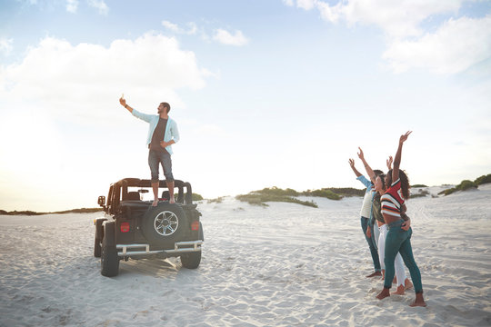 Young man on jeep tire taking selfie with friends on beach