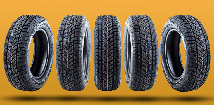 Photorealistic close-up shot of four brand new car tires, detailed tread pattern
