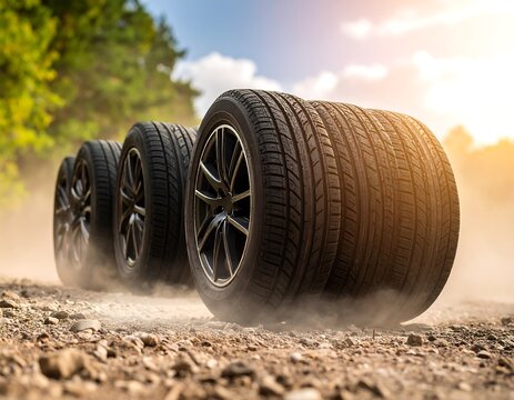 Tire warehouse filled with many new car tyres in stock. Auto repair shop, service center supply with rubber wheels, winter, summer tires. Transportation, automotive industry, auto industry background.