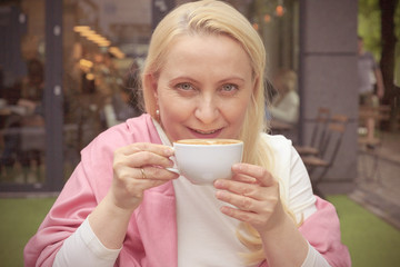 Smiling beautiful woman 45 years old drink coffee in a cafe. Toned
