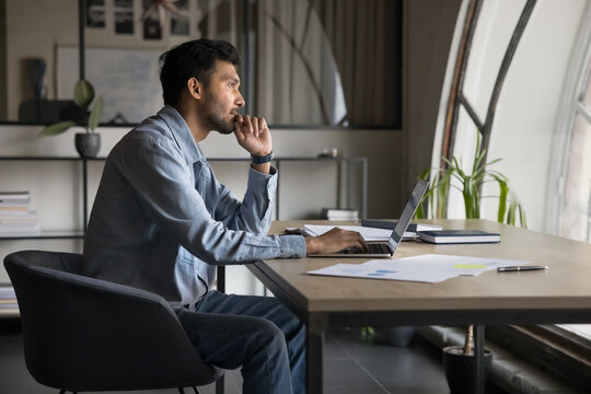 Thoughtful pensive business man planning marketing strategy, authentic Indian executive manager focused on work looking out the window for inspiration while working on laptop computer in modern office