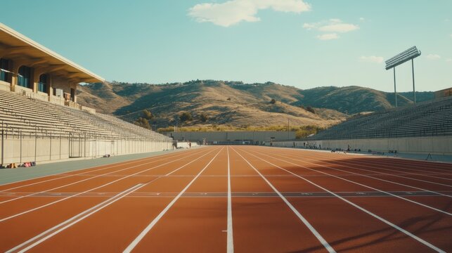 College stadium with athletes preparing for a 400m race. Featuring concentration and strategy