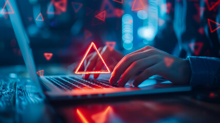 Staffs or Businessman, programmer, developer using computer laptop with triangle caution warning sign for notification error and maintenance concept.