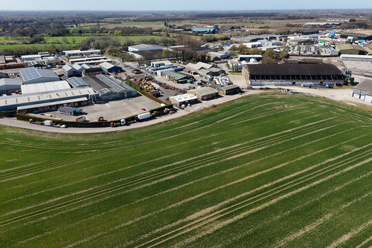aerial view of Former RAF Pocklington . WW2 bomber Airfield J Type Hanger