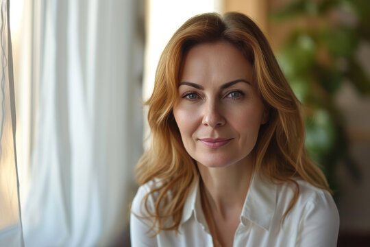 A confident woman in her late 40s or early 50s sitting at her desk in her office