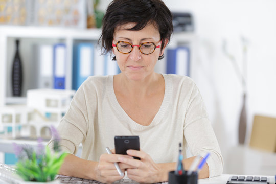European female cloud consultant in her early 40s walking through high-tech server room holding smartphone. Thoughtful professional analyzing data, SaaS infrastructure and IT consulting banner