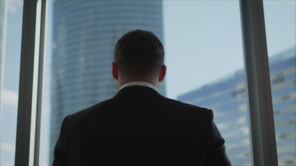 Young successful businessman standing in front of the windows, looking into the distance to the city. Successful man stands in the neoboksreb. A businessman stands in front of a window.