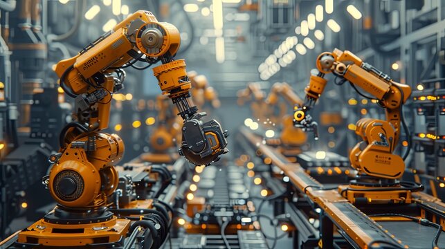 Futuristic industry 4 0 factory floor with robots and IoT devices seamlessly integrating, optimizing production