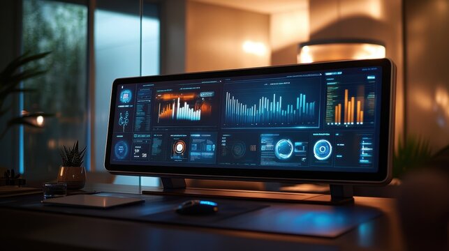 Displaying a sophisticated analytics dashboard on a large computer monitor in a dimly lit, contemporary office, enhancing productivity and decision making in the modern workplace