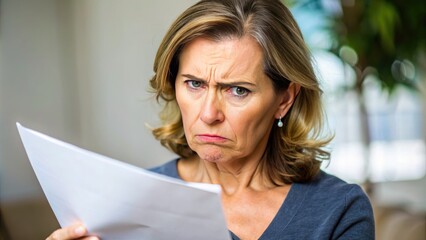 Frustrated woman in her 40s, with a disapproving expression, reads a document or letter, her eyebrows furrowed and lips pursed in discontent.