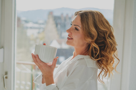 Portrait of beautiful young woman, 42 years old, with cup of hot tea by the window. Warm, cozy home.