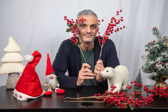 Man ready to celebrate Christmas. The man is forty-two years old, of Italian origin and is surrounded by Christmas decorations