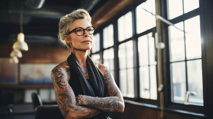 Portrait of a 50 year old woman tattooed at the office