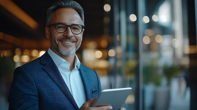 Portrait of happy smiling 45 years old business man executive standing in office using digital tablet Middle aged businessman manager wearing suit glasses working on professional finan : Generative AI