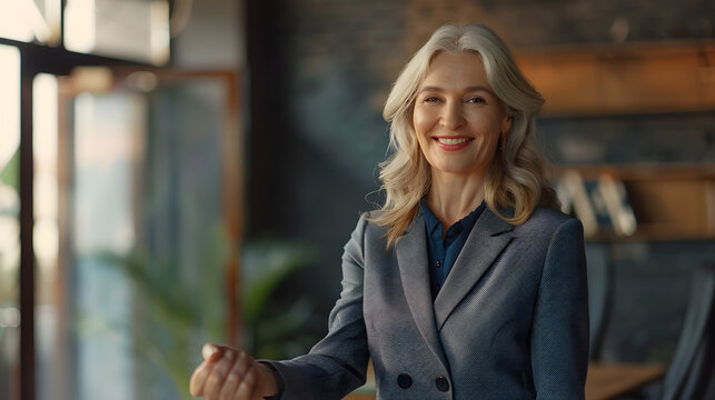 A joyful middle-aged businesswoman manager shaking hands with a client in the office, a smiling female executive successfully closing a deal with a partner at a meeting table.