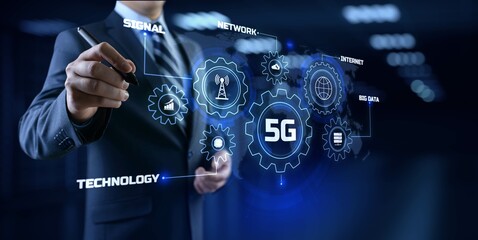 5G High-speed internet connection concept. Businessman pressing button on screen.