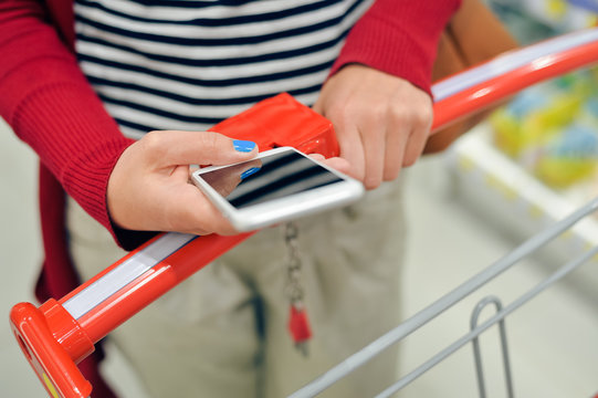 Closeup on smart phone online shopping in woman hand. Shopping center in background.