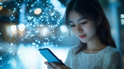 Wireless communication network concept Mobile technologyYoung asian woman using a smart phone : Generative AI
