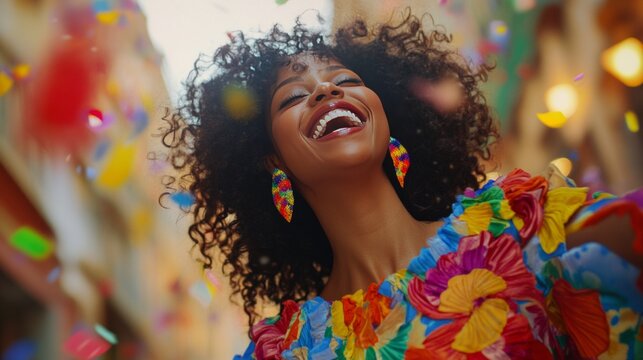 A Black woman with curly hair wearing a colorful dress, dancing and laughing, vibrant and joyful, ultra-detailed, 4k