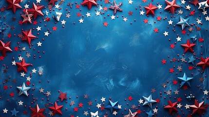 blue white and red star shaped glitter falling on blue background, with copy space , 4th of July celebration