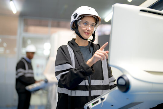 Engineer use augmented reality software in smart factory production line with automated application . Futuristic machinery in working in concept of Industry 4.0 or 4th industrial revolution.